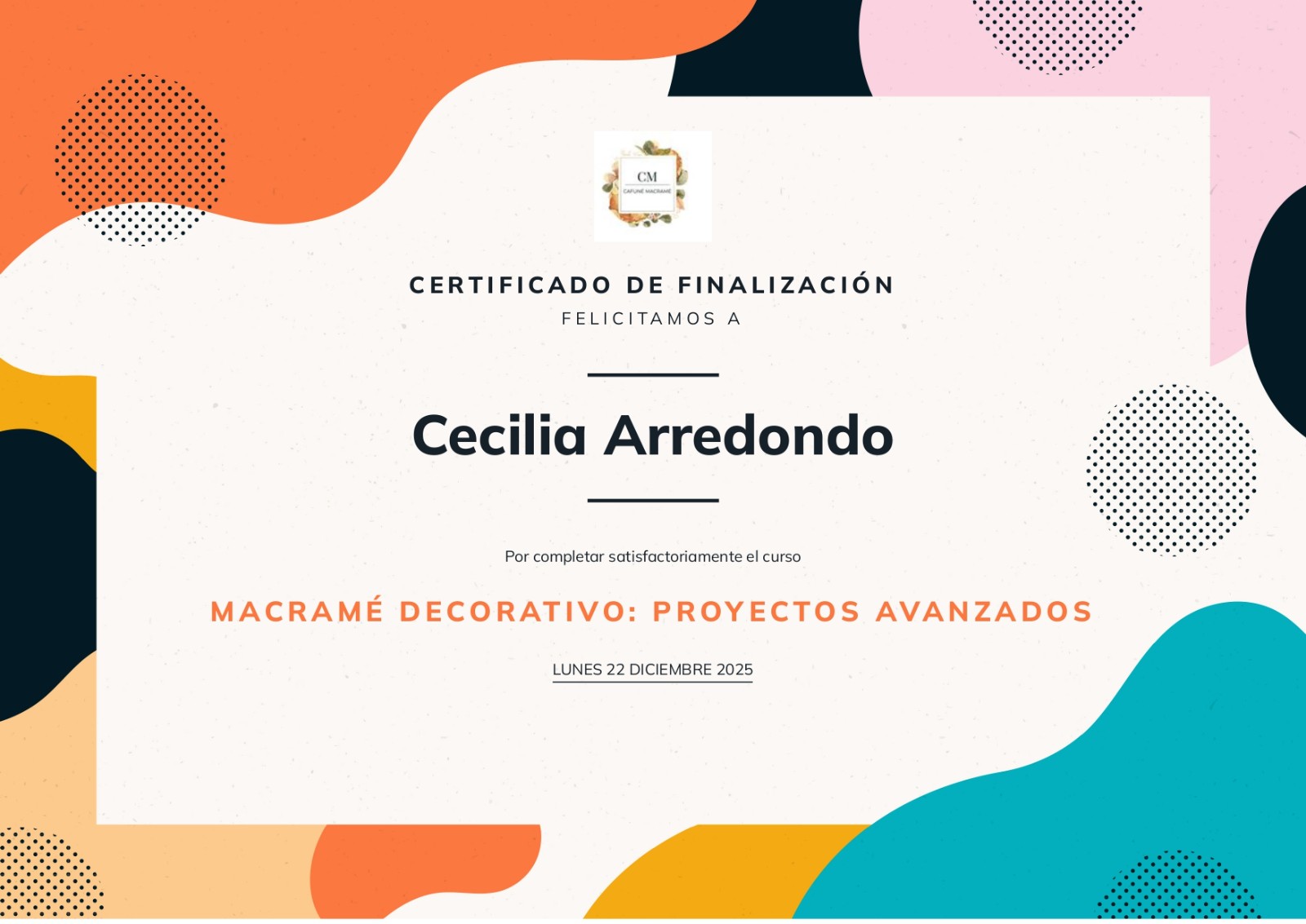 Acceso a tu certificado personalizado avalado por Cafuné Macramé al finalizar el curso